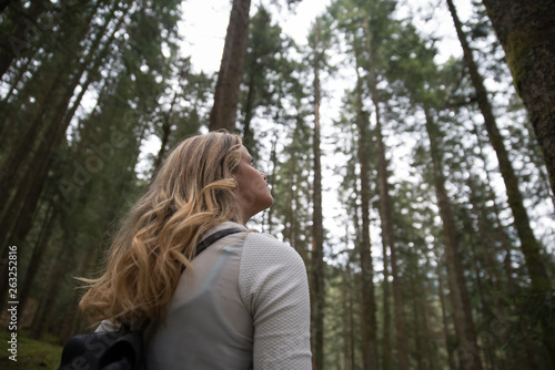Girl Walking In A Green Forest With High Trees And Looking To The